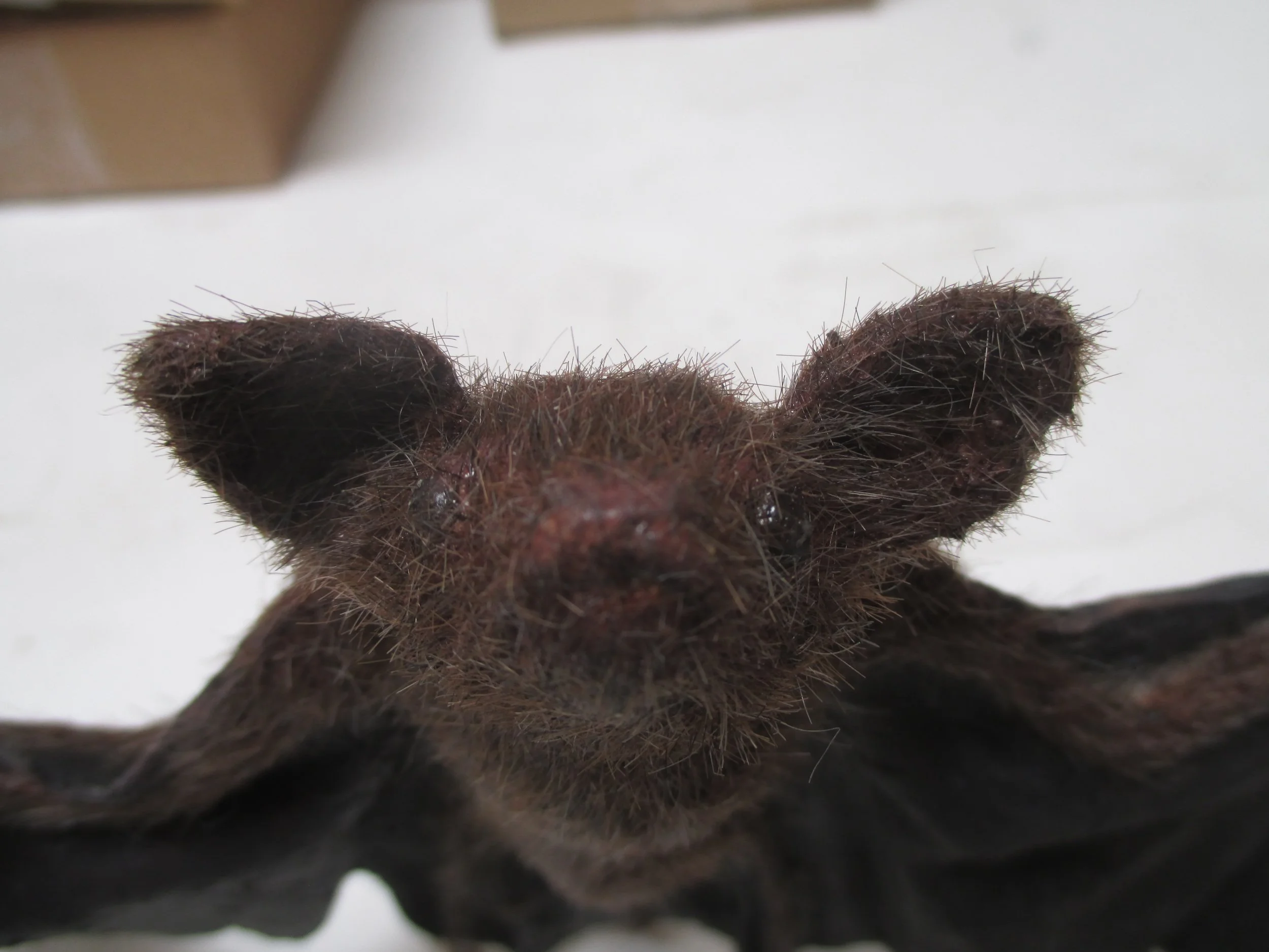 Fake Mouse-eared Bat Prop was Sculpted first in clay, then a mold made, then the mold is run to get the bodies for these. Wings are adjustable to be more collapsed or stretched out. Latex skin. Silicone wings. Flocked body and face.